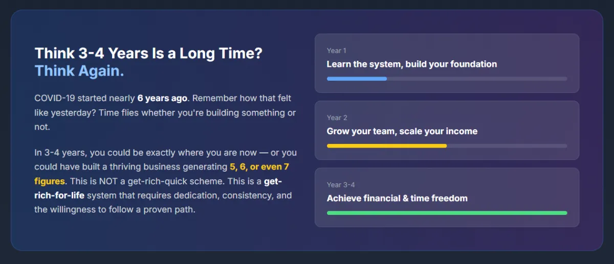 Absolutely not. This is a legitimate business backed by a 51-year-old company that requires dedication, consistency, and hard work. Our most successful members built their income over 1-3 years. Think about it — COVID-19 was nearly 6 years ago. Time flies whether you're building something or not. In 3-4 years, you could have a thriving business generating 5, 6, or even 7 figures.