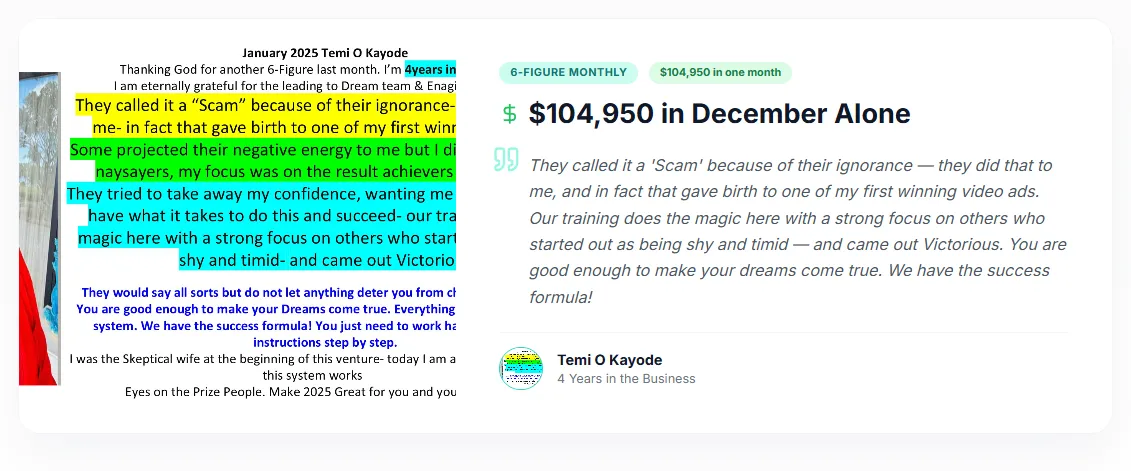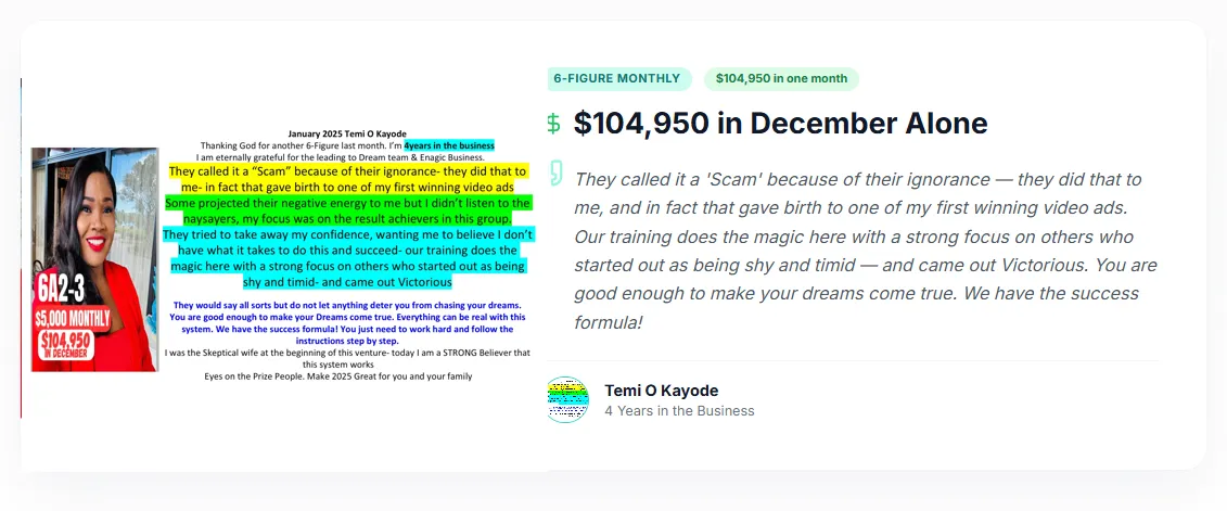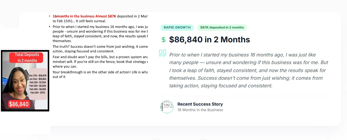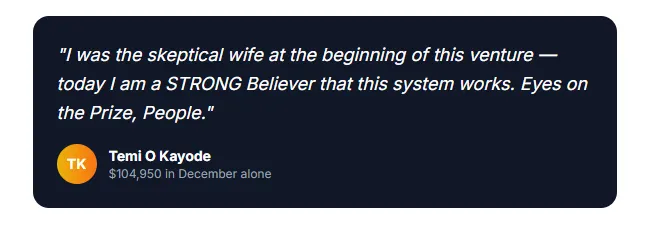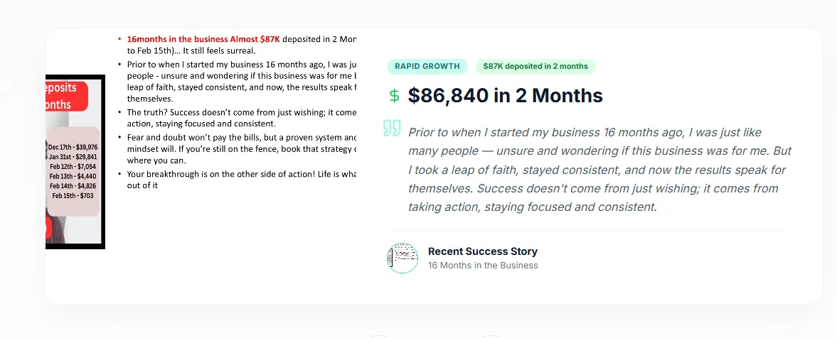 Earnings vary based on effort and commitment. Some members earn their first income within weeks, while others build to 5-6 figures monthly within 1-3 years. Our testimonials show real results: $86K in 2 months, $276K in 12 months, $104K in a single month. These are real people who followed the system consistently.