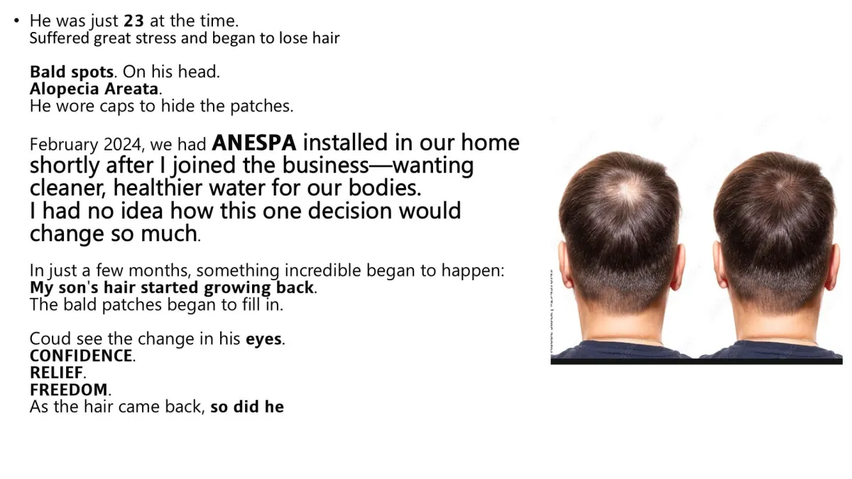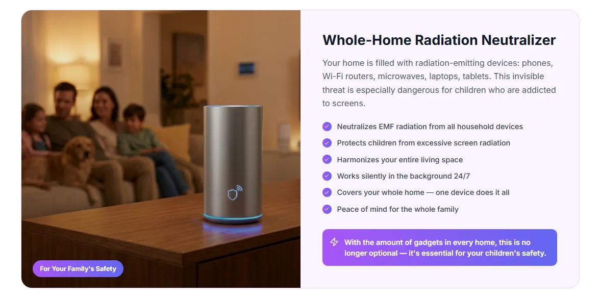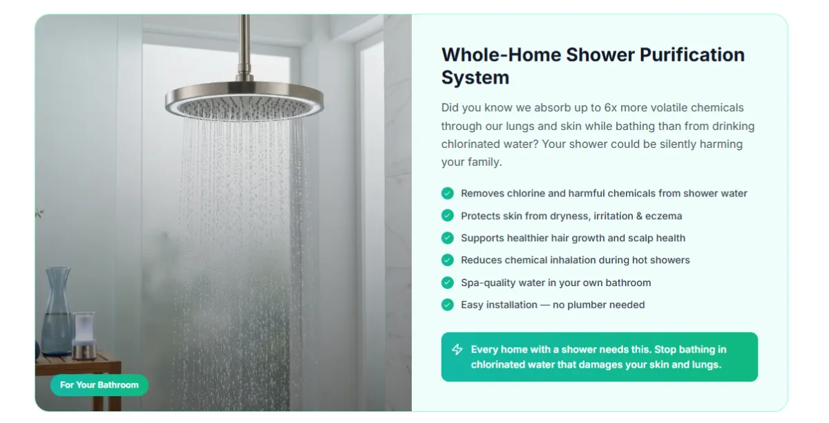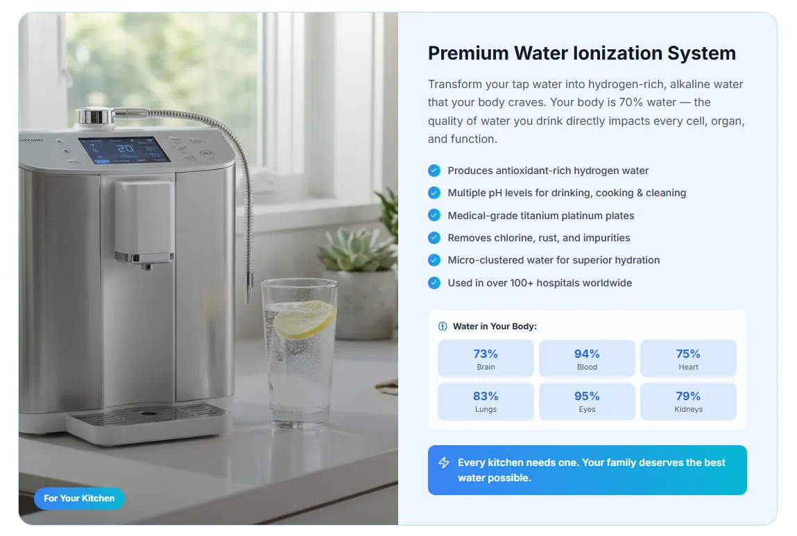 The business is built around 4 essential wellness products that every home needs: (1) A premium water ionization system for your kitchen, (2) A whole-home shower purification system, (3) A radiation neutralizer that protects your family from device EMF, and (4) Premium turmeric wellness supplements. These products enhance health while providing a financial vehicle for freedom.