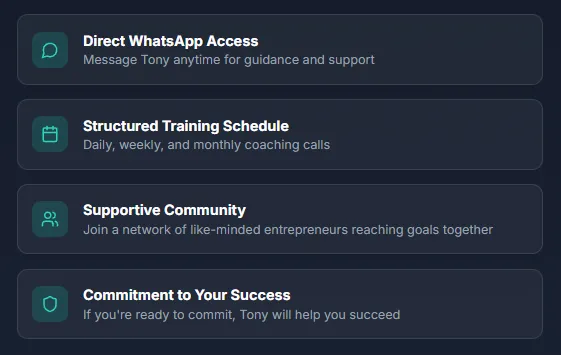 You'll have direct WhatsApp access to your mentor Tony Adegbenro (+44 78282 59750), plus daily, weekly, and monthly training calls with the community. You can also connect with Tony on Facebook for motivational posts and join the private business group. You're never alone in this journey.
