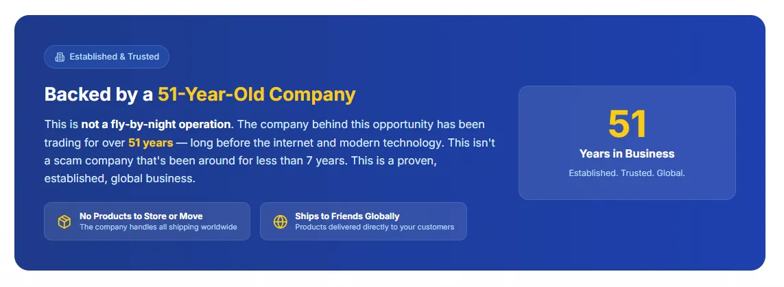 No! That's the beauty of this system. The 51-year-old company handles all product storage, logistics, and shipping worldwide. Products are shipped directly to your customers anywhere in the world. You focus on building your business — the company does the heavy lifting.