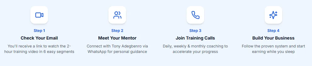 You receive instant access to our comprehensive 2-hour training video (in 6 easy segments) that shows you exactly how to automate the system and build wealth on your own terms. You also get a personal mentor (Tony Adegbenro), access to daily/weekly/monthly coaching calls, and entry into our supportive community. Plus, it comes with a 30-day money-back guarantee.
